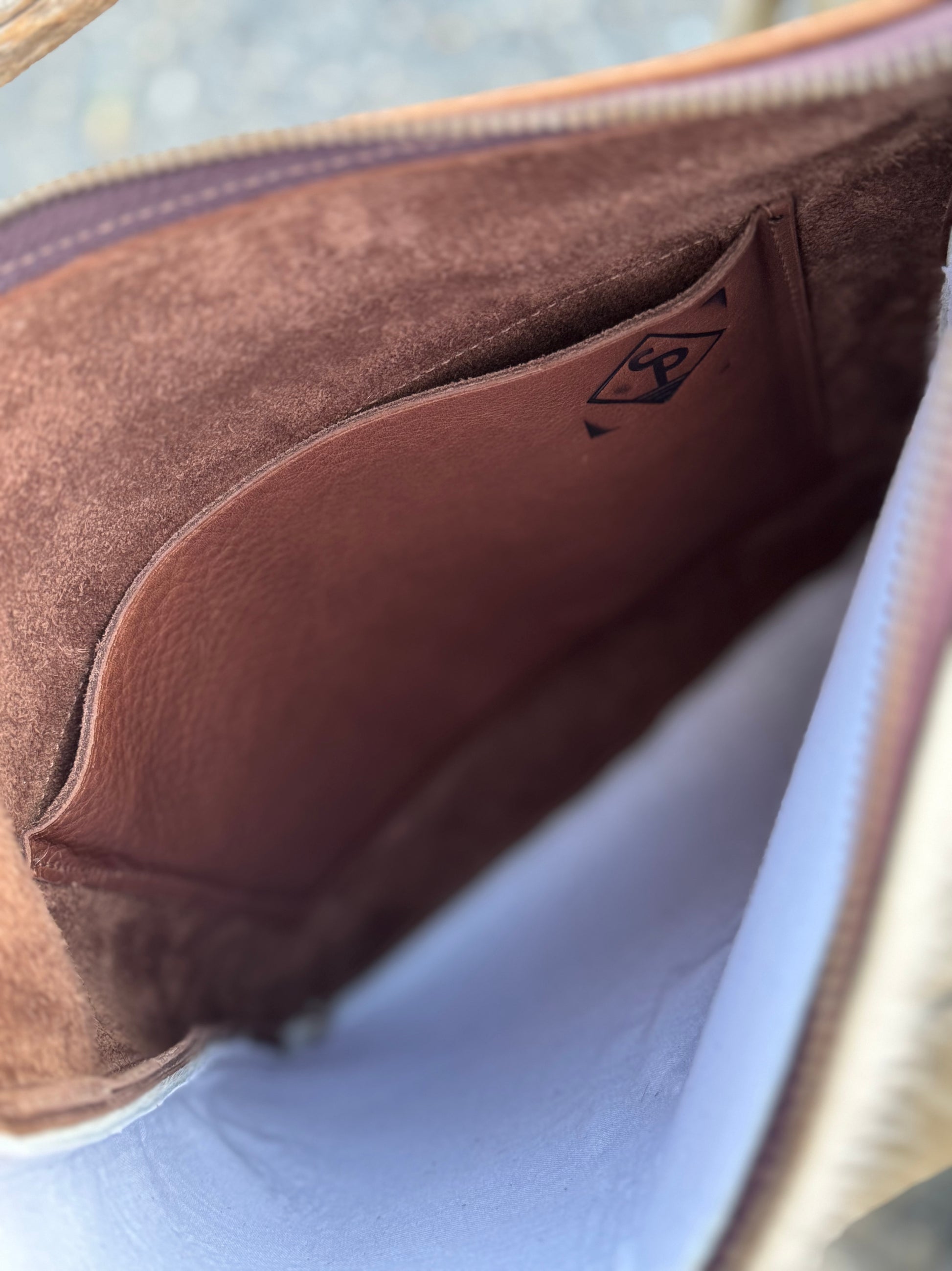 The Petaluma Bag features a striking brown and white cow hair front complemented by stylish brown fringe, making it a unique accessory for any outfit. Designed with a long strap, it can be comfortably worn over the shoulder or crossbody to keep your hands free. Its zipper closure ensures your belongings stay secure, while both exterior and interior pockets provide convenient storage for essentials. Perfect for those seeking a blend of practicality and standout style.