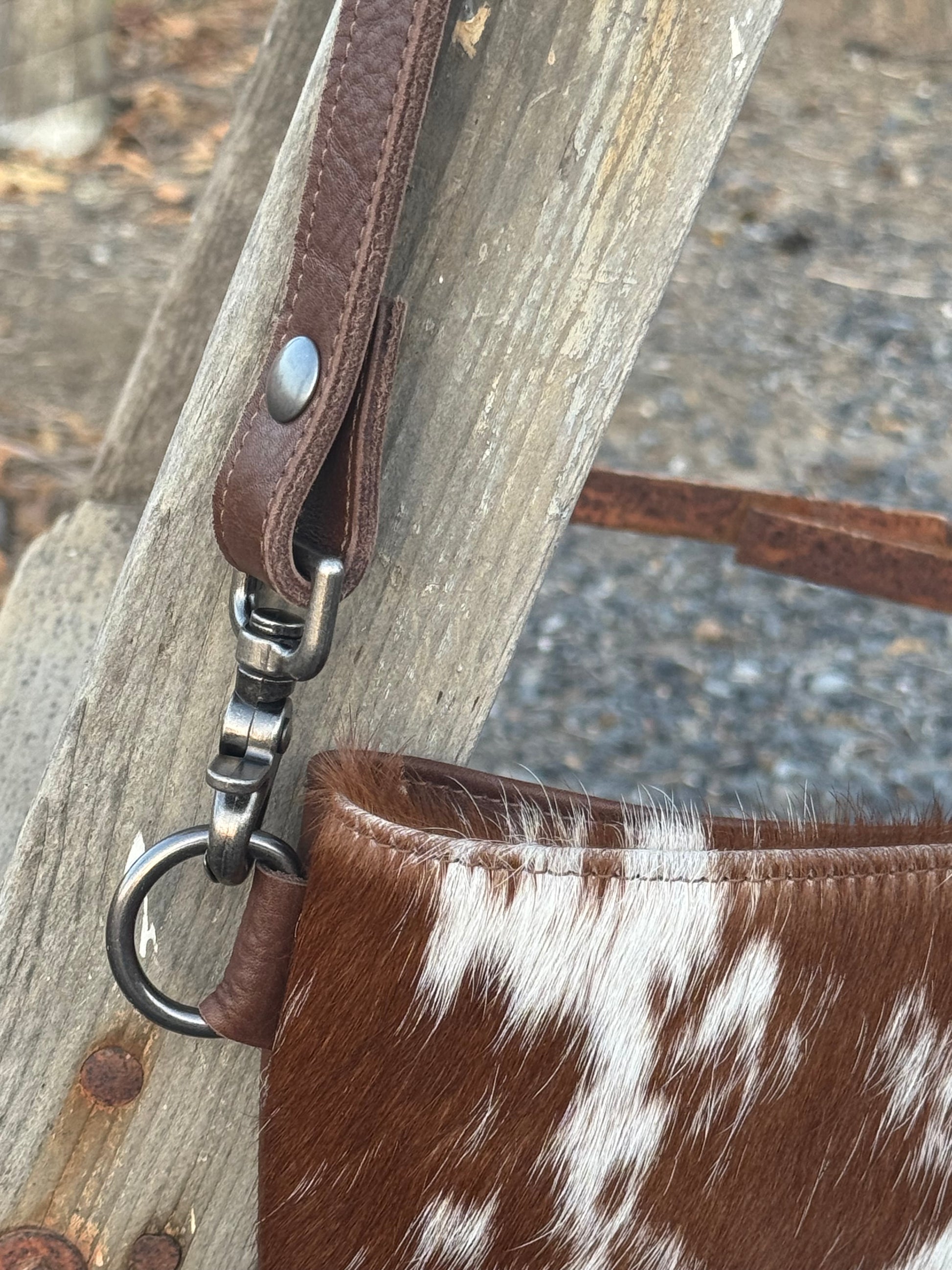 The Petaluma Bag combines a distinctive brown and white cow hair front with soft brown leather on the back, featuring a zippered pocket for easy access and an interior pocket to organize your belongings. Its snap closure ensures your items stay secure, while the 1" wide strap can be comfortably worn over the shoulder or crossbody, adapting to your needs throughout the day. This bag is designed to offer both functionality and style, supporting your everyday activities with ease.
